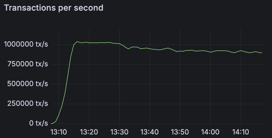 - Public Grafana dashboards with 1M TPS runs: Run 1, Run 2, Run 3