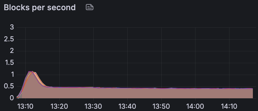 To improve the situation we implemented a proportional–integral–derivative controller (with some fine-tuning to better represent the system’s response) that modifies the load TPS to target the desired block rate. Experiments are fully reproducible with very low variance, allowing to catch the deviations of ~1%. That allowed us to fully automate the benchmarks and add them as periodic CI jobs, with the perf measurements and telemetry saved as artifacts for each run.