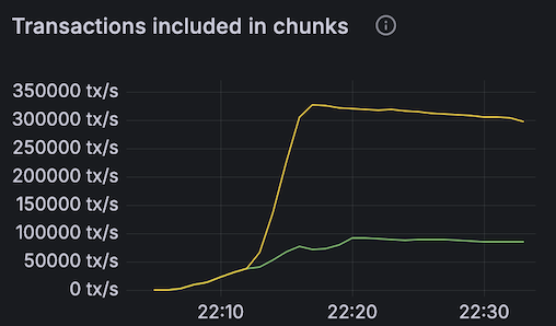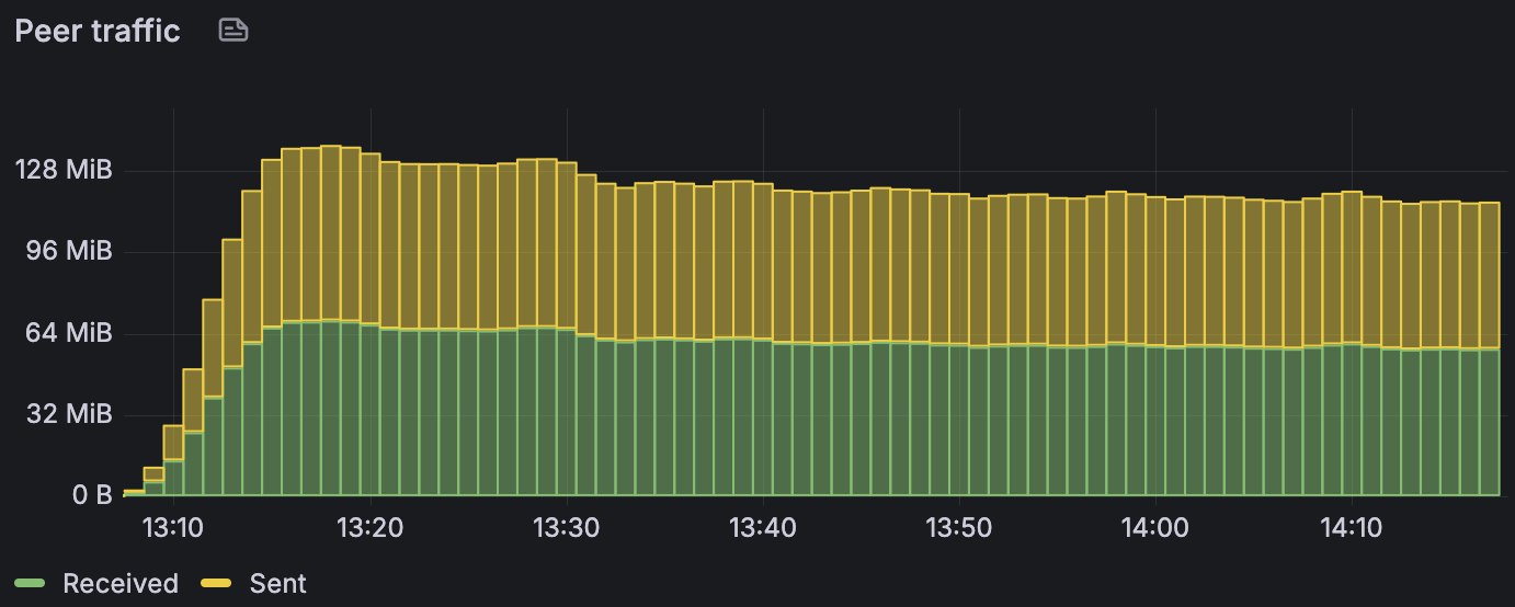 Chunk producer nodes generate and sign the transactions: this simplified our benchmarking setup and allowed us to exclude RPC and focus on validator throughput. In the steady state, we apply a constant load and the system operates at 0.5 block/s without chunk/block misses. Peer traffic reaches around 64 MB/s in send and receive.